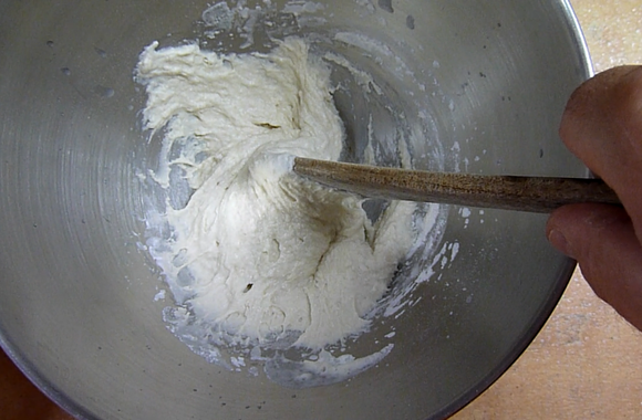 1Préparer une poolish : une sorte de levain avec la farine, l'eau et la levure. Mélanger l'eau à température ambiante avec la levure et ajouter ensuite la farine. Malaxer à l'aide d'une spatule en bois pendant environ 10 minutes. Laisser reposer une nuit au réfrigérateur en prenant soin de mettre un film alimentaire dessus.