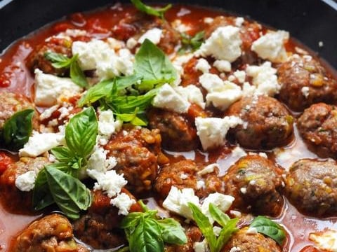 Servir les boulettes d'agneau dans leur jus, arrosées du reste d'huile d'olive et parsemées de miettes de féta et de feuilles de basilic.