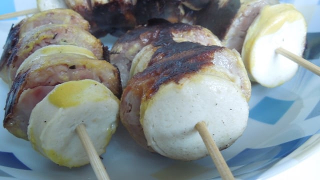 Mélanger la moutarde de Reims et le cognac puis imprégner les brochettes du mélange.