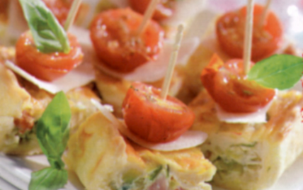 - Coupez les tomates en deux, arrosez les d'huile d'olive. Prélevez des copeaux de parmesan avec un épluche-légumes. Coupez la tarte en carrés. Posez sur chaque, un copeau de parmesan et une demi tomate. Maintenez par un pique et servez de feuilles de basilic.
