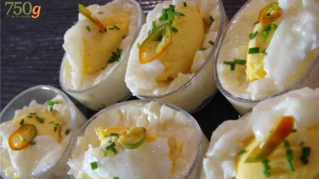 De jolies verrines trompe l"œil façon œuf mimosa : trois textures, trois couleurs, et pourtant ce n"est que de l"œuf ! Succès assuré...