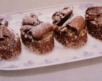 Après refroidissement - décercler les gâteaux à l'aide de la flamme d'un chalumeau ou linge mouillé chaud - entourer les cotés de granulé chocolat - disposer sur le dessus des copeaux de chocolat - saupoudrer de sucre glace - 3
