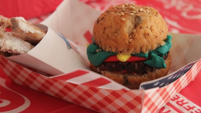 Des bâtonnets de pâte sablée pour remplacer les frites, des muffins à la place du pain à burger, une tranche de brownie pour remplacer le steak, un glaçage royal vert à la place de la salade... Voici comment transformer le mini burger salé en version sucrée, un résultat épatant pour combler les plus petits comme les plus grands !
