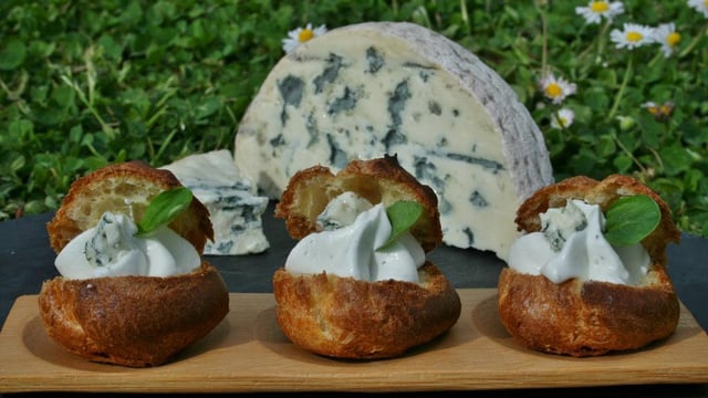 Battre la crème à la Fourme d'Ambert jusqu'à consistance d'une chantilly bien ferme. Ouvrir les choux et les garnir. Décorer d'un petit cube de Fourme d'Ambert et d'une feuille de mâxche et servir aussitôt.