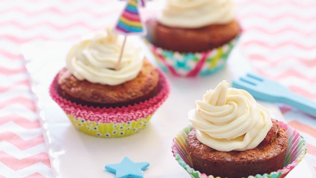 Avant de servir vos cupcakes, déposez la crème au mascarpone dans une poche à douille cannelée et dressez de petites quantités de crème sur chaque cupcake.