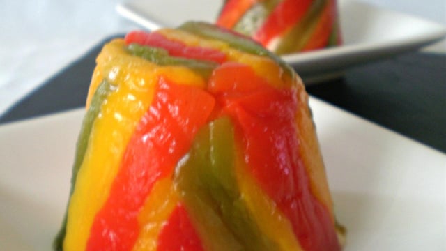 Chemisez 2 petits verres de film alimentaire et tapissez-en le fond et les parois de lanières de poivrons en les chevauchant légèrement.