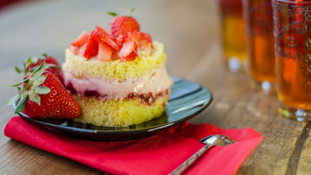 Des petits gâteaux à la génoise et mousse de fraises.