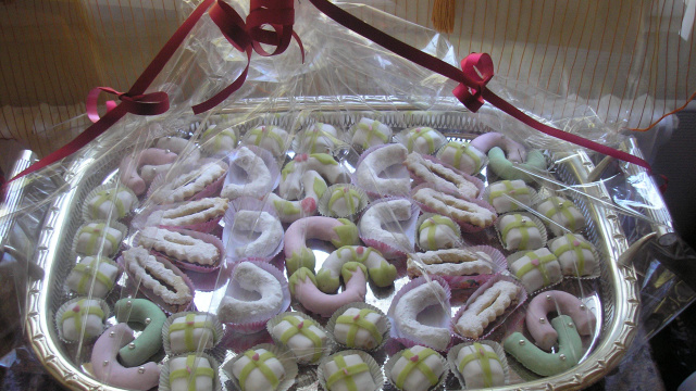 Des petits fours en demi-lune ou en forme de petits cadeaux, bien présentés avec du thé pour le plaisir des invités.