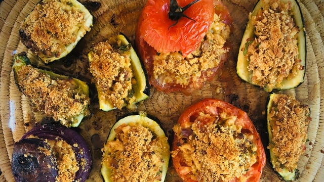 Garnir les légumes de cette farce, déposer les chapeaux sur les tomates et l’oignon rouge. Terminer en parsemant avec le reste de chapelure et un petit filet d’huile d’olive. Enfourner 30 minutes à 180°C.