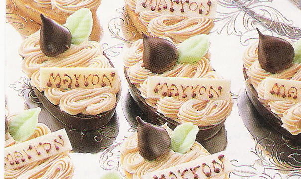 Étaler une petite abaisse de pâte d'amandes blanche - écrire sur le dessus plusieurs fois au cornet " marron " avec du chocolat décor - ( beurre mou - cacao en poudre ) - les découper - les tenir en réserve. - 2Mise en place :Faire la pâte sucrée - selon la méthode habituelle - foncer les moules - les tenir au réfrigérateur.