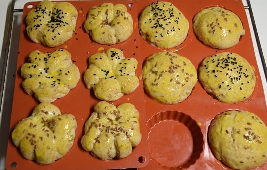 3Laisser lever dans un endroit chaud pour que la pâte double de volume. Badigeonner les surface de jaune-lait et parsemer les graines de nigelle et sésame. Enfourner dans un four préchauffé à 180°C pendant 25 min. Démouler et laisser refroidir.