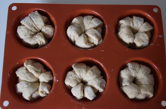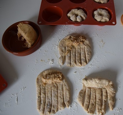 2Placer une cuillère à soupe d'effiloché sur la partie non coupée, ajouter un peu de fleur de sel si nécessaire et rouler la pâte. Former une couronne avec le boudin obtenu et le placer dans un moule à muffin. Faire de même avec les autres boules.