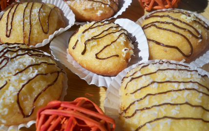 A la sortie du four imbiber des boulettes de jus d'orange avant de les passer dans la noix de coco.