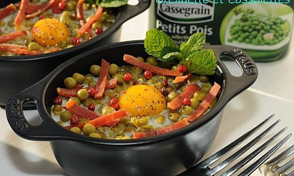Action :Couper le Serrano en allumettes. Dans un grand bol mélanger le jambon (réserver quelques tranchettes pour la déco) avec les petits pois, l'échalote et la crème. Répartir dans les cassolettes. Casser un oeuf de caille au dessus de chaque cassolette en réservant le jaune dans la coquille.
