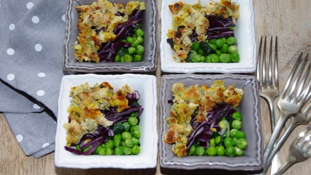 C'est une délicieuse entrée aux saveurs et textures pleines de caractère. Les petits pois sont fondants, le chou rouge est croquant et le crumble est... croquant fondant !
