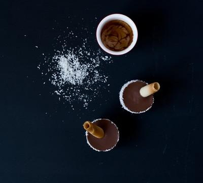 Poser 1 Cigarette Russes DELACRE debout dans chaque pot. Verser la ganache et réserver 4 heures au réfrigérateur.