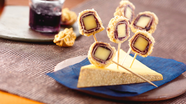 Atez les bordures de vos tranches de pain. A l'aide du rouleau, aplatissez la mie. Tartinez de confiture de cerises noires. Réalisez des bâtonnets de fromage. Déposez les en haut de votre feuille de pain et roulez serré. Coupez les extrémités, puis coupez en 4 bouchées égales.