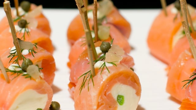 Découpez vos petits roulés avec un bon couteau et seulement après enlevez le film alimentaire. Présentez les roulés avec un pic pour faciliter leur prise en main. Décorez-les avec un câpre et un brin d'aneth.