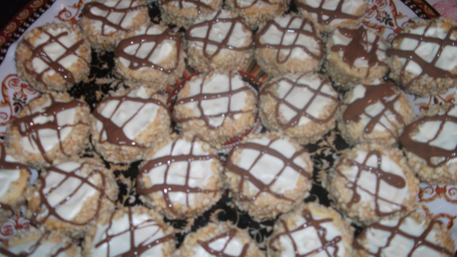 Les rouler dans des cacahouètes grillées et finement moulues et décorer avec du chocolat blanc et noir.