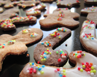 Préparer un glaçage avec le sucre glace et 1 ou 2 cc de jus de citron. Tartiner le dessus des biscuits par touches (pointes des étoiles, yeux et boutons des gingerbread men, traits des sucres d'orge), ou sur toute leur surface. Humecter le bout de votre doigt sur un essuie mains mouillé, de manière à coller les boules sucrées décoratives sur votre doigt et les appliquer sur les parties recouvertes de glaçage des biscuits. Je vous suggère de glacer 3/4 biscuits, puis les décorer, et ainsi de suite, comme cela le glaçage ne sera pas sec sur les biscuit, facilitant l'adhésion des billes colorées).