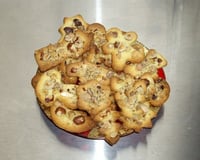 - 2Le jour-mêmeConcasser grossièrement les fruits secs.Préchauffer le four à 180°C (th. 6).Pour une plaque à pâtisserie recouverte de papier cuisson, coucher des petits tas de pâte. Mettre des fruits secs sur le dessus. Dorer.Enfourner environ 25 minutes.