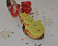 Disposer au centre de votre biscuit une demi-cuillère à moka de crème au beurre. Déposer par dessus votre décoration en pâte d'amande en appuyant doucement pour étaler la crème.
