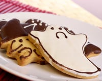 Trempez délicatement et assez vite vos biscuits dans l'une ou l'autre couleur pour faire la tenue du fantôme. Laissez refroidir puis dessinez les yeux et la bouche avec un pinceau alimentaire fin et la couleur de chocolat inverse. Amusez-vous bien !