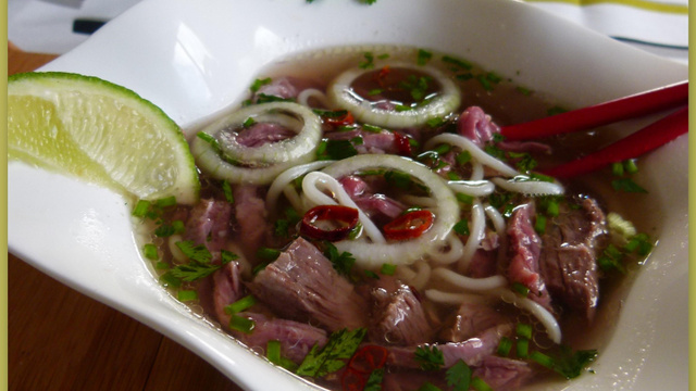 Arrosez le tout avec le bouillon bien chaud et servez de suite le Pho Bo accompagné des condiments (citron vert, coriandre et ciboulette ciselées, oignons).