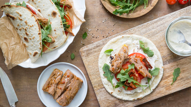 Tartinez de ricotta, salez, poivrez puis garnissez avec les filets de thon, la roquette, les tomates fraiches et séchées et le basilic et repliez en deux pour déguster.