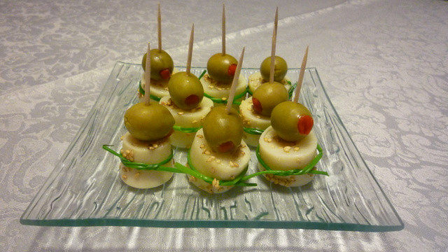 Avec un cure dent, piquer une olive sur la rondelle de cœur de palmier.