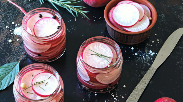 Mettez les rondelles de radis dans votre bocal stérilisé, ajoutez les grains de poivre, la feuille de laurier, la branche de romarin coupée en morceaux et ajoutez le liquide frémissant. Le liquide doit bien recouvrir les radis.