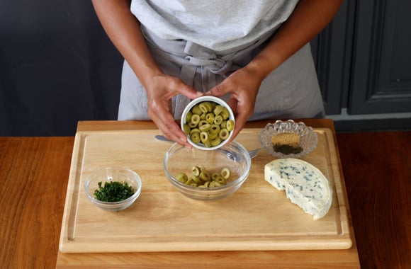 4Versez les olives coupées en rondelles dans un saladier.