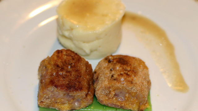 Dresser en déposant les pieds de porc panés sur une lanière de gelée de petits pois et compléter avec la purée et la sauce.