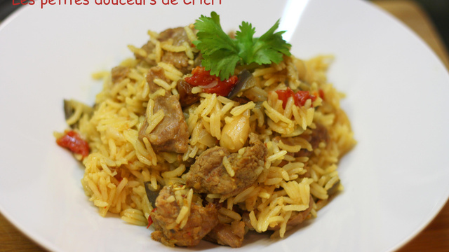 Plat complet à base de riz, d'agneau et de légumes avec une cuisson rapide.