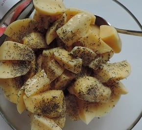 2Préparer les pommes de terre : Peler, couper les pommes de terre en 4 ou en 8, les rincer, les sécher et les débarrasser dans un plat. Ajouter un peu d'herbes de Provence, de fleur de sel, de poivre de Kampot, d'huile et bien mélanger.