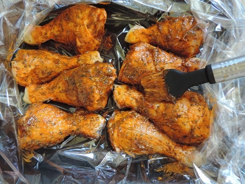 1Préparer la marinade : Dans un bol, mélanger la marinade avec un peu de fleur de sel au piment d'Espelette, d'herbes de Provence et du romarin. Ajouter un peu d'huile et bien mélanger. Disposer les pilons dans le sachet cuisson posé dans un plat allant au four et les badigeonner de marinade.