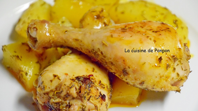 3Assemblage : Placer les pommes de terre sur les pilons de poulet, refermer le sachet. Enfourner dans un four préchauffé à 180°C pendant 50 min. Sortir le plat du four, ouvrir le sachet en prenant garde à la vapeur ! et servir dans les assiettes en parsemant un peu de poivre de Kampot.