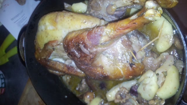 Pintade cuisinée au cidre avec des cerneaux de noix, des chataignes et des pommes.
