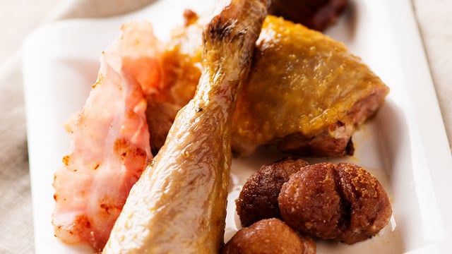 Servir la pintade découpée et nappée de sauce avec la purée de marron.