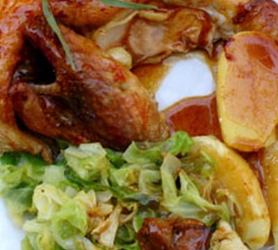 19. Découper la pintade et servir le tout sur assiette. Au dernier moment, ajouter la sauce.