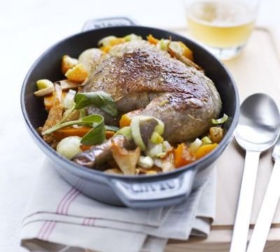 Laissez mijotez à couvert à feu doux pendant 30 min en mélangeant délicatement de temps en temps pour que la préparation n'attache pas au fond de la cocotte. Mouillez avec un peu d'eau si nécessaire. Ajoutez la sauge et les girolles, remuez et laissez cuire 5 min. Servez sans attendre.