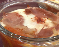 Versez dans des cocottes individuelles aux 2/3. Réalisez un creux à l'intérieur en vous aidant d'une cuillère à soupe pour y casser les œufs au centre. Salez. Entourez avec du jambon de Bayonne. Faites cuire au four à 190°C pendant 10 minutes.
