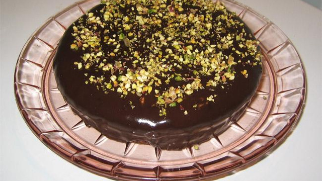Cassez le chocolat en petits morceaux et faites le fondre dans une casserole à feu doux avec la crème. Nappez le gâteau et saupoudrez avec les pistaches hachées. - 3