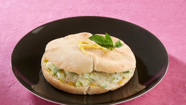 Pour monter le sandwich, étaler 1 cuillère à soupe de Sauce Curry Mangue Amora sur la partie inférieure du pain pita. Recouvrir d'1 cuillère à soupe d'oignons puis de 3 à 4 cuillères à soupe du mélange au concombre.