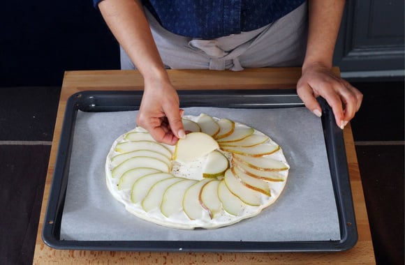 5Répartissez joliment les lamelles de poires.