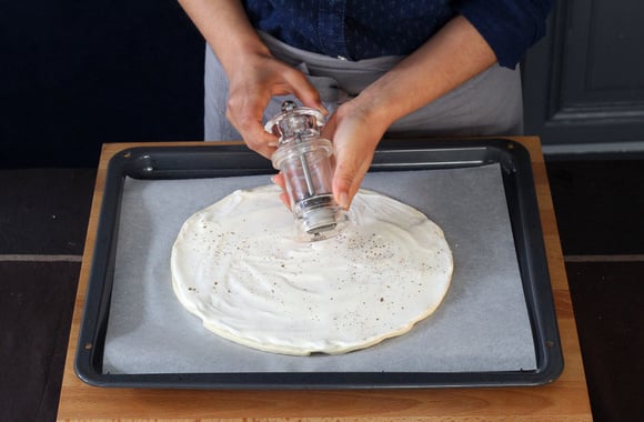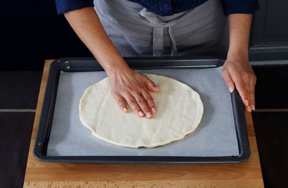 2Préchauffez le four à 210°C. Tapissez la plaque du four de papier sulfurisé. Etalez la pâte à pizza directement sur le papier sulfurisé.