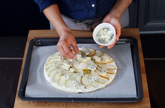 6Répartissez les dés de Fourme d'Ambert. Enfournez la pizza pour 15 min environ.