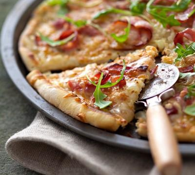 Etaler la pâte à pizza et la napper avec la sauce à l'oignon en prenant soin de laisser un petit rebord d'1/2 cm environ. Ajouter les tranches de jambon et parsemer de la moitié du Sublime Filante. Enfourner la pizza une quinzaine de minutes jusqu'à ce que la croûte colore. A ce moment, ajouter le reste du Sublime Filante et remettre au four pour le faire fondre. Sortir du four et parsemer de roquette.