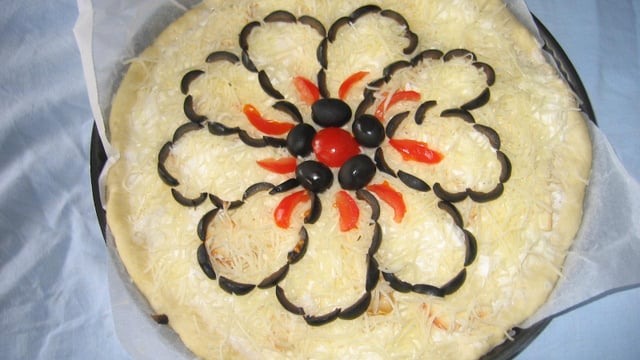Garnir la pizza en dessinant une fleur, comme sur la photo ou un autre dessin de votre choix, d'ailleurs !