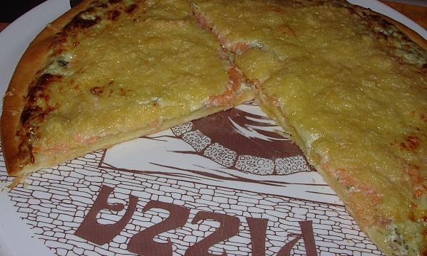 Faire la pâte, mettre 70g de beurre et 500g de farine pour une pâte épaisse. Faire cuire la pâte épaisse 15 min. Après la cuisson, enlever du four avec vos gants et mettez la crème fraîche sur toute la pâte ensuite le saumon ensuite le gruyère ensuite vous pouvez rajouter 4 oeufs.